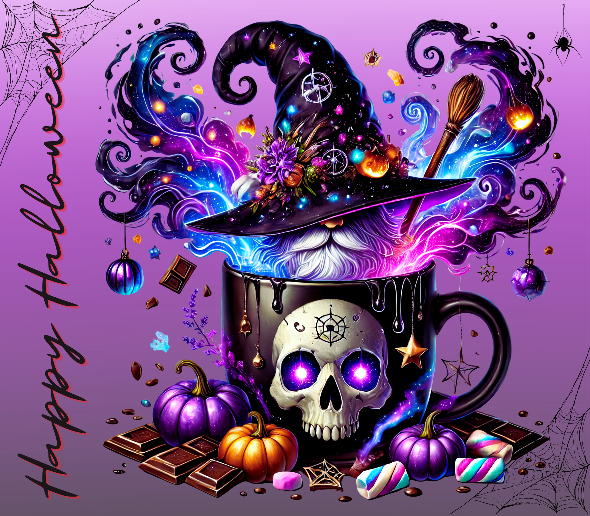 Dieser leuchtend lilafarbene Tumbler „Happy Halloween“ verzaubert mit seinem detailreichen Design aus Zauberhut, Schädel, Kürbissen und magischen Farben in Violett- und Blautönen.